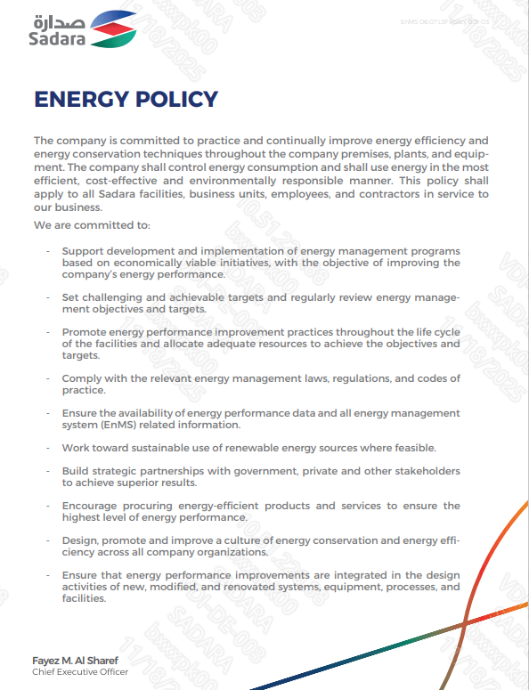 Our climate governance is strengthened by environmental and energy policies along with environmental and energy management systems certified by ISO 14001:2015, Responsible Care (RC 14001) and ISO 50001:2018. The policies cover regulatory and stakeholder requirements regarding environment and energy management. To maintain accountability and assess performance and progress, Sadara conducts regular audits on energy, water, waste and our environmental management system. Furthermore, we seek to improve the measurement and reporting of our footprint through plans to automate the consolidation of environmental data.